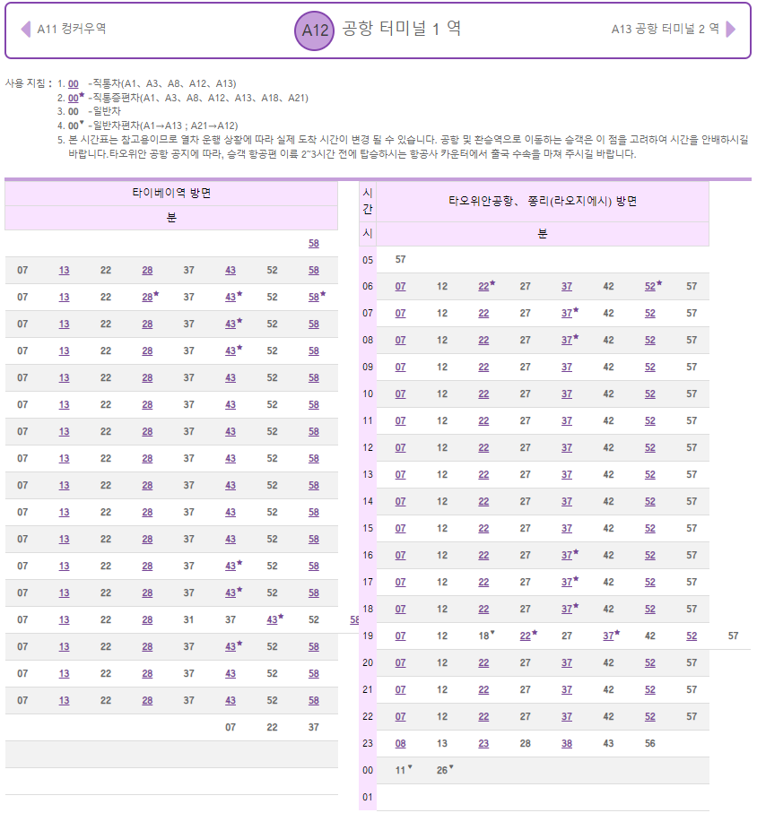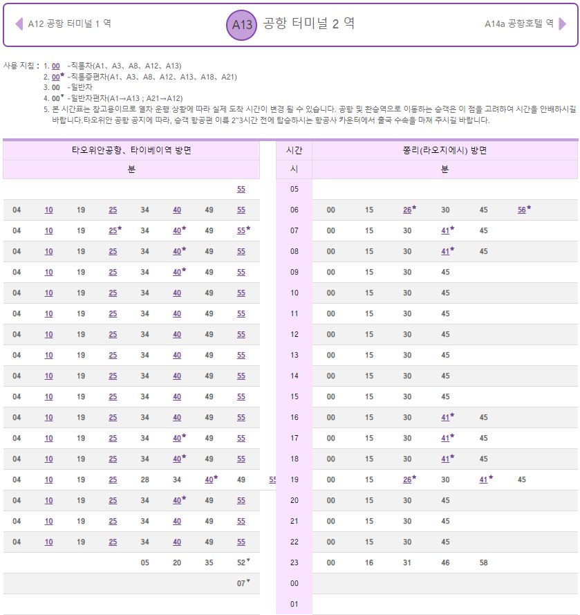 ** 날짜별로 열차 운행 시각은 상이할 수 있습니다. 더 정확한 운행 시간을 확인하시기 위해서는 아래 링크를 통해 타오위안 철도 홈페이지에서 탑승 날짜 지정 후 시간표 조회해 보시기 바랍니다.
