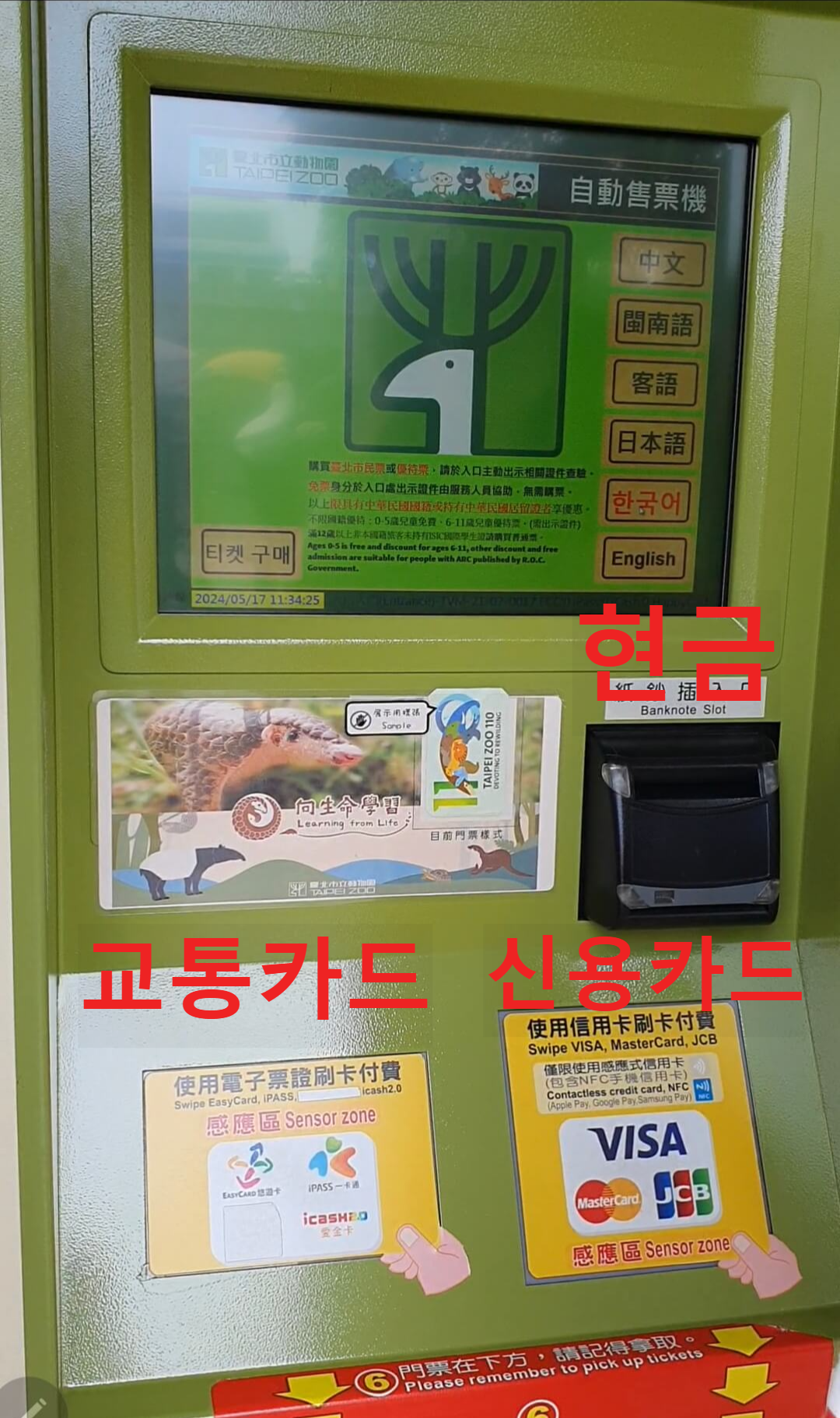 현금을 넣거나 신용카드/ 교통카드(이지카드 등) 각 위치에 결제수단을 터치하여 입장료 금액 결제