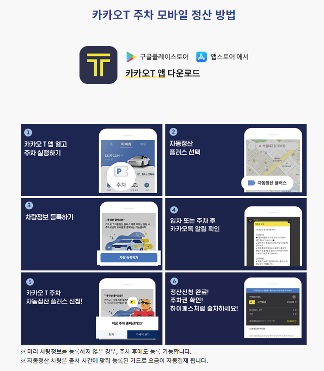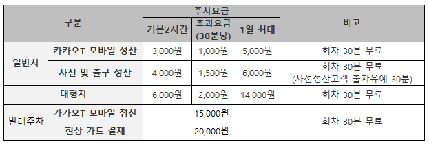 - 입차 후 30분 전까지 출차 시 무료, 정산 후 30분 전까지 출차 시 무료