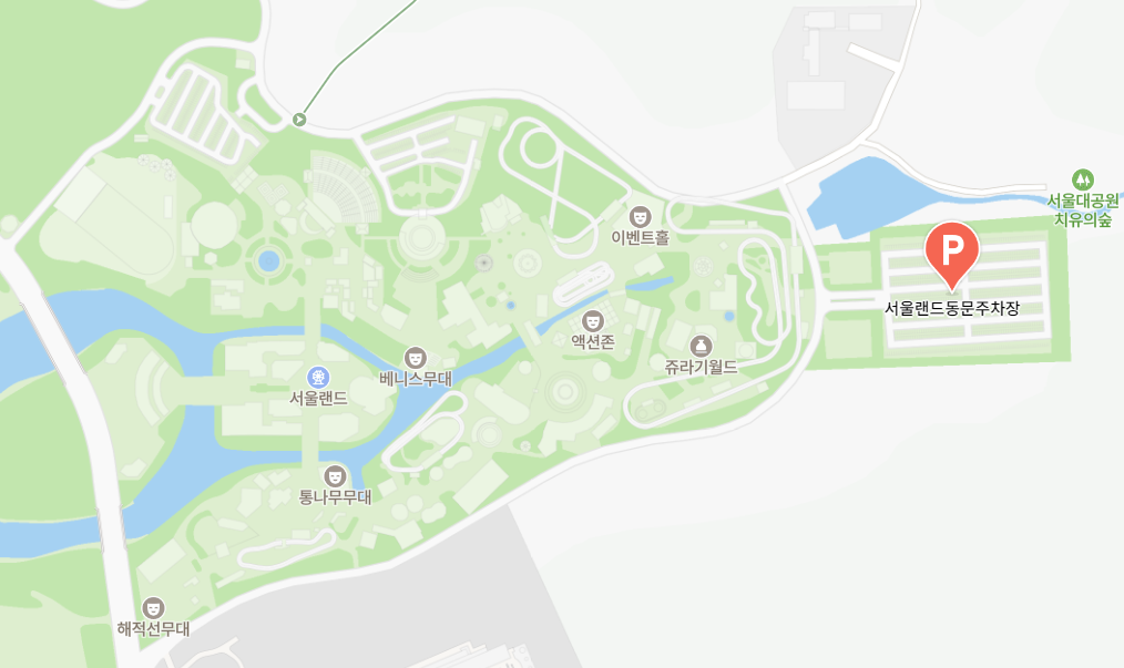 서울랜드 이용고객 전용주차장으로 서울랜드 동문 앞에 위치해 있기 때문에 차량에서 하차하신 후 많이 이동할 필요 없이 바로 서울랜드로 입장이 가능합니다. 서울대공원 주차장 보다 규모가 작아 서울랜드 동문 주차장 만차 시 대공원역 근처의 서울대공원 주차장(유료)에 주차하셔야 하니 참고하시기 바랍니다.