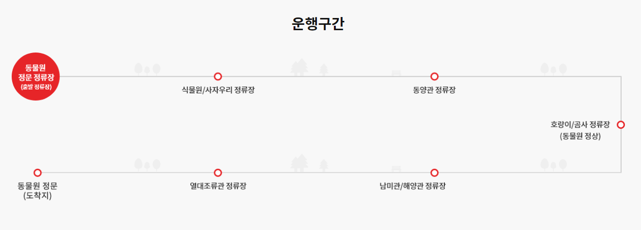 제1정류장 (서울동물원 앞) | 09:00 ~ 동물원 폐장 후 10분 | |